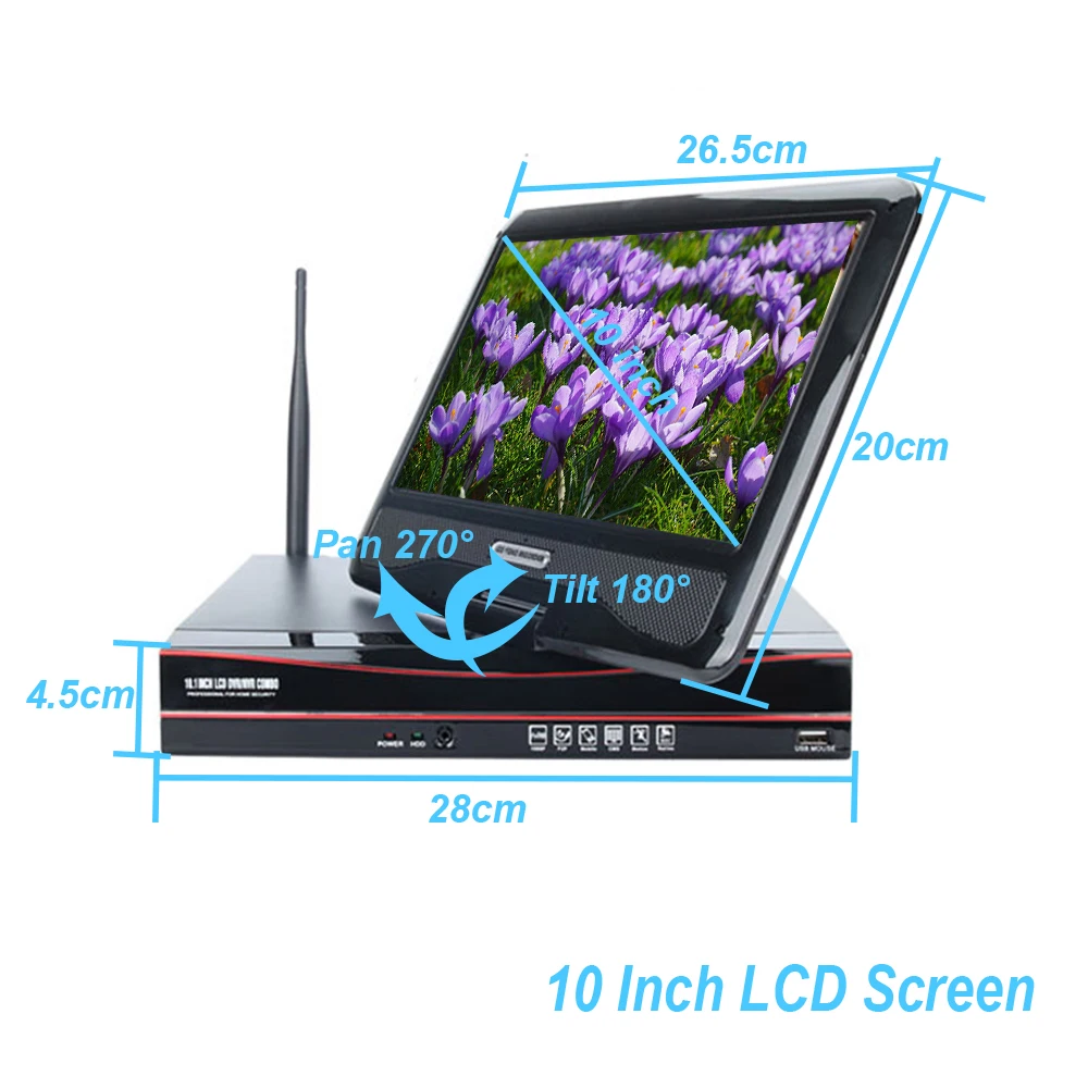 4CH Home Security Wifi CCTV System Wireless NVR Kit 10" LCD Monitor Screen 720P 1MP Outdoor IP Came
